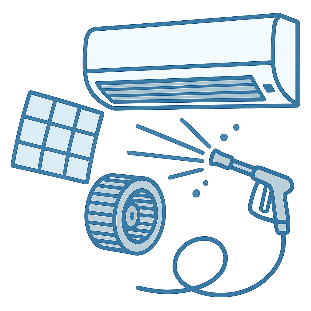 エアコン内部のフィルター・ファン・熱交換器を分解し、専用の高圧洗浄機でカビやホコリをすみずみまで洗浄します。